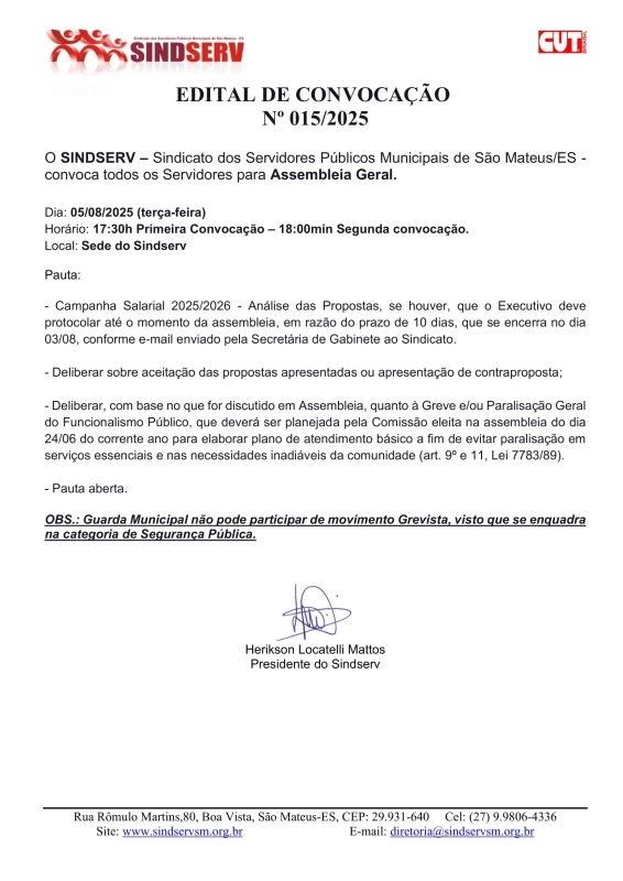 O SINDSERV convoca todos os servidores públicos municipais de São Mateus/ES para Assembleia Geral!