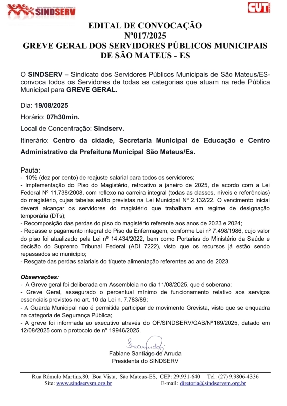 Edital de Convocação Nº 017/2025 - GREVE GERAL PARA TODOS OS SERVIDORES MUNICIPAIS DE SÃO MATEUS