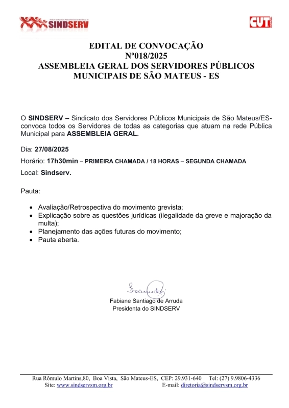 Edital de Convocação Nº 018/2025 - ASSEMBLEIA GERAL PARA TODOS OS SERVIDORES MUNICIPAIS DE SÃO MATEUS