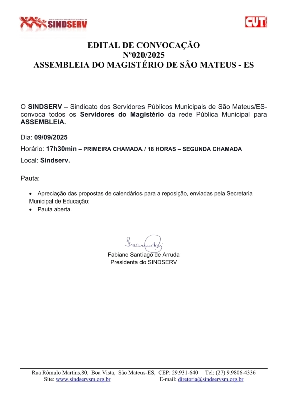 Edital de Convocação Nº 020/2025 - Assembleia Extraordinária para todos os servidores do magistério
