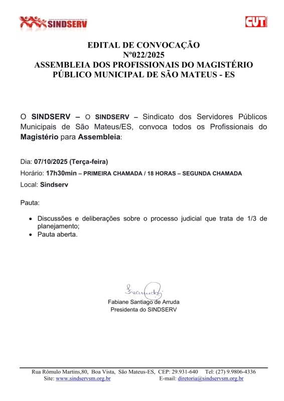 O SINDSERV - Sindicato dos Servidores Públicos Municipais de São Mateus/ES, convoca todos os Profissionais do Magistério para Assembleia: