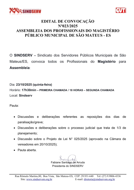 O SINDSERV - Sindicato dos Servidores Públicos Municipais de São Mateus/ES, convoca todos os Profissionais do Magistério para Assembleia: