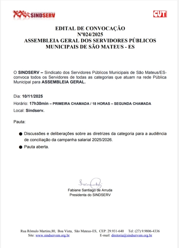 O SINDSERV convoca todos os servidores públicos municipais de São Mateus/ES para Assembleia Geral!