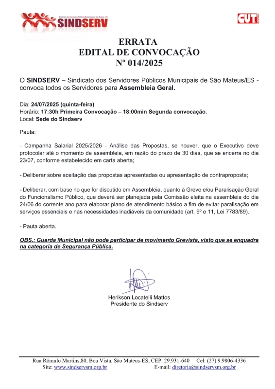 ERRATA EDITAL DE CONVOCAÇÃO Nº 014/2025